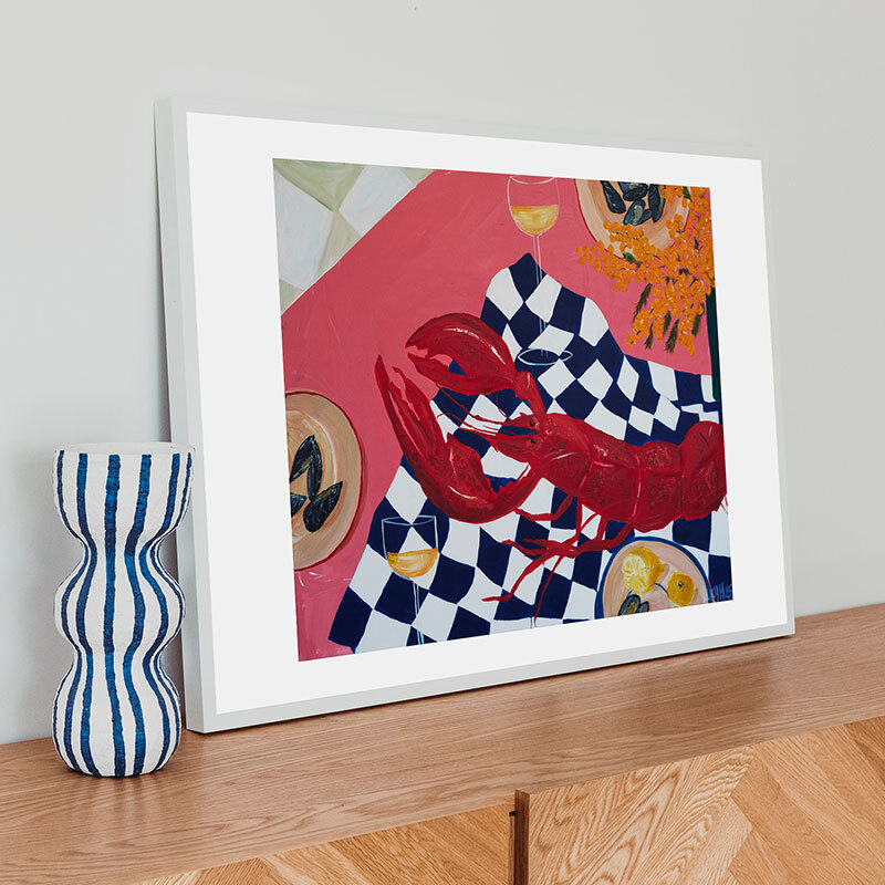 Lucy Muss perfectly captures the essence of elegance in this Lobster dinner scene art print.